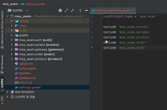msa_exam으로 설정, 유레카 서버는19090포트로 실행 - 게이트웨이 서비스는