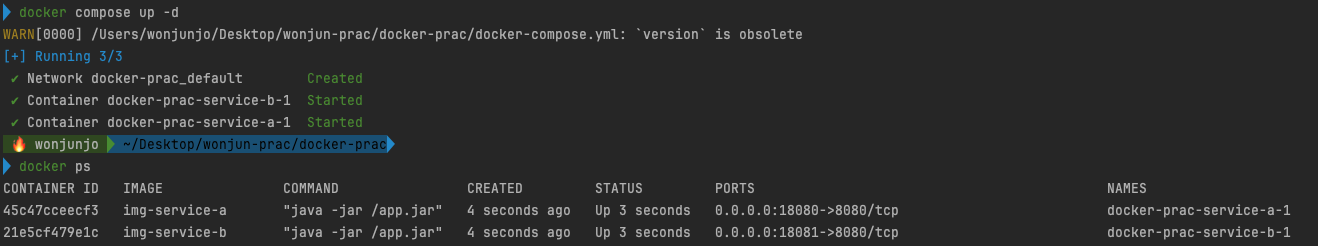 docker compose up --build -d # 옛날 버전은 docker-compose로 사용해야 한다.
