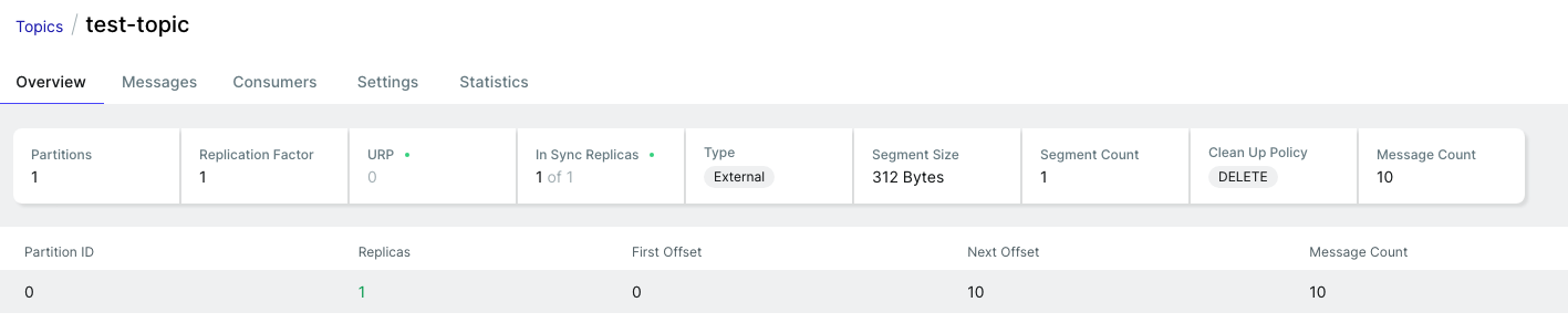 test-topic이 새로 생겼으며, ProducerService에서 메시지를 10개 send하도록 반복문을 돌려논 결과로 메시지의 개수가 10개가 생겼다.