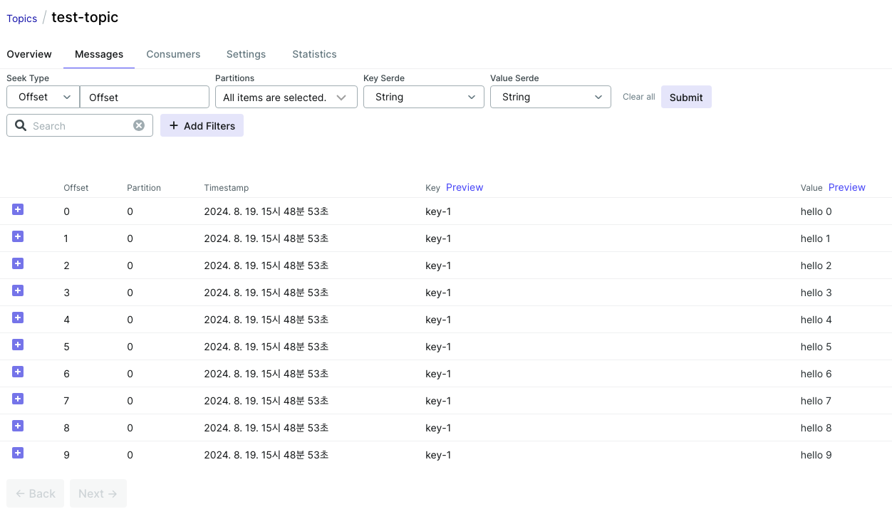 10개의 메시지가 담겨있는 것을 확인할 수 있다. Key 값은 request param으로 설정한 key-1이다.